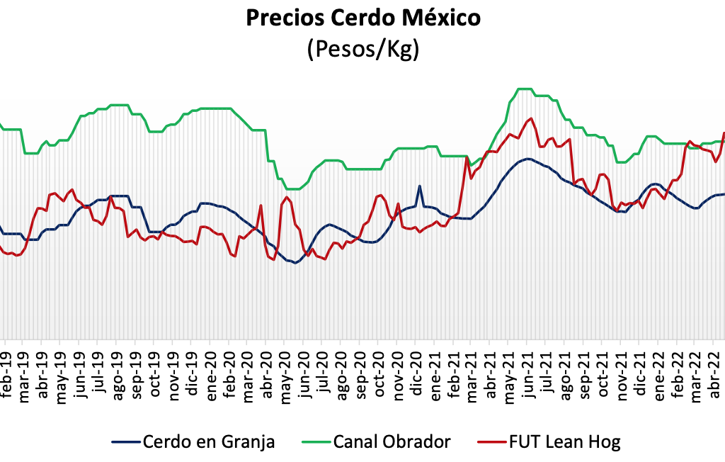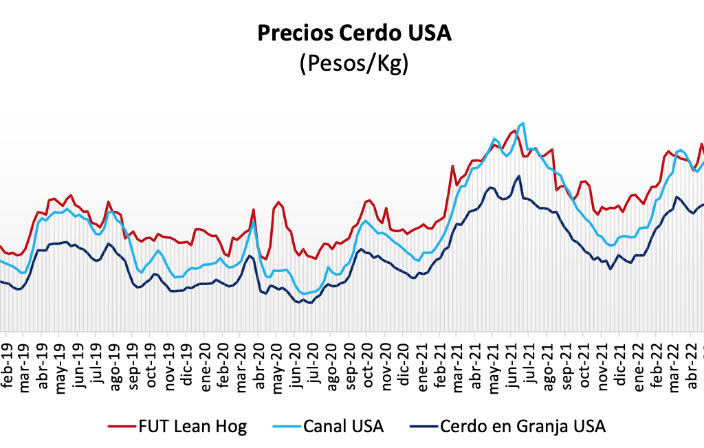 29 de julio de 2022 admin boletín Boletín 55 sector porcino Precio del cerdo semana 29 En la semana 29, observamos una variación al alza en los precios de los granos, con un 2% de incremento para el maíz y el sorgo, mientras que la pasta de soya presenta una caída de 4%, aunque se ha mantenido bastante volátil debido a la fuerte demanda que existe tanto en el sector avícola como en el de cerdo, mientras que el ”Lean Hog”, se ubicó en $51.60 pesos con una reducción de 1.5% semanal.RETOS.- Mantener el abasto de cerdos a nivel nacional, con precios en los que difícilmente podrán trasladar los costos de alimentación que se volvieron más completos hace seis meses, al inicio de la engorda de los hatos que están finalizando para llegar a sacrificio actualmente.VENTAJAS.- La expectativa global sobre la demanda de cerdo se mantiene positiva, haciendo que los precios a lo largo de la cadena se mantengan ligeramente al alza, y el verano y las compras de cárnicos aún no caen por la estacionalidad. El precio promedio nacional de cerdo en granja tuvo un ligero reacomodo con variación de – 0.01% en la semana 29, quedando apenas una décima de centavo abajo, en los $44.13 pesos por kilo, 7.22% por arriba del precio pagado en 2021 y 47.36% sobre los valores registrados en 2020.El precio de carne en canal nacional se mantiene sin variación por tercera semana consecutiva,recordemos que es un comportamiento usual el mantener el precio de la canal en México por hasta 4 semanas, se observa en $55.65 pesos por kilo, registrando así una caída del 2.19% respecto de los precios pagados en 2021, mientras se mantiene 26.91% por arriba 2020. El precio de cerdo en granja se movió 14.48% por debajo del precio futuro de Lean Hog, mientras que la canal se mantiene 7.84% por arriba del precio futuro. El precio promedio de cerdo en granja en EUA nuevamente con tendencia al alza en la semana 29, con un crecimiento moderado de 1.78% y un precio de $42.71 pesos por kilo, 21.18% sobre 2021 y con un importante crecimiento del 225.11% sobre 2020. El precio de carne en canal EUA se registra en $54.63 (MXN/KG), -0.34% sobre la semana 28, 15.87% y 254.05%, para la misma semana 2021 y 2020, respectivamente.El margen del precio del cerdo en México sigue 3.32% por arriba del de EUA, y la canal 1.87%por arriba del precio pagado en el país vecino. Precio cerdo USA semana 29 Ver en PDF Share this content: